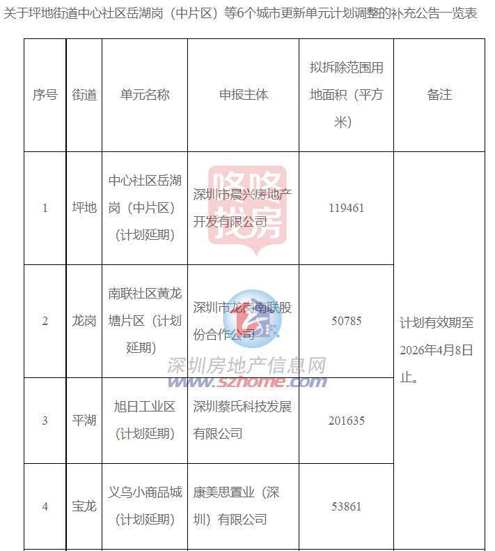 该更新项目于2021年列入《2021年龙岗区城市更新单元计划第二批计划》,于2022年7月19日、2023年11月20日发布两次计划延期公告,现再次发布计划延期公告,计划有效期至2026年4月8日止