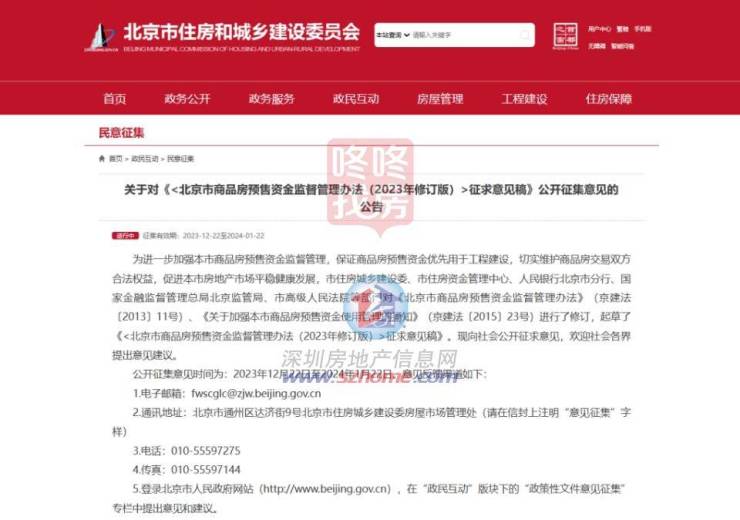 12月22日,北京市住建委网站发布关于对《〈北京市商品房预售资金监督管理办法(2023年修订版)〉征求意见稿》公开征集意见的公告。