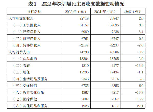 近日,国家统计局深圳调查队公布2022年深圳住户收支与生活状况调查数据。