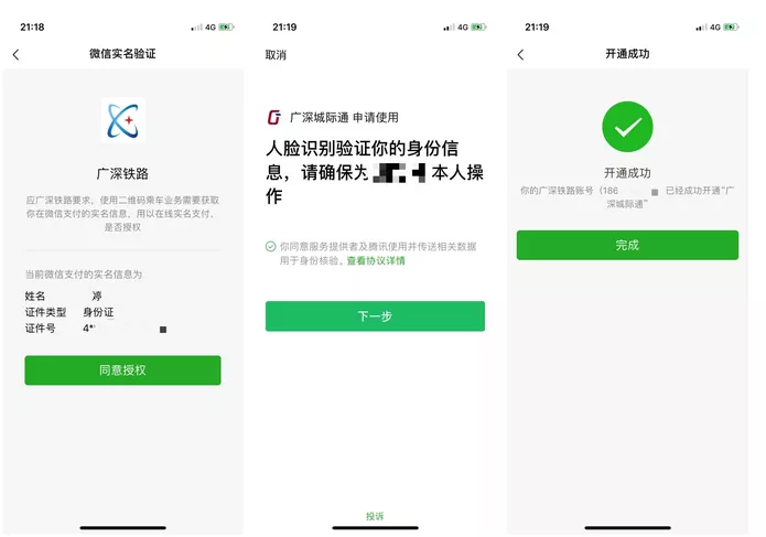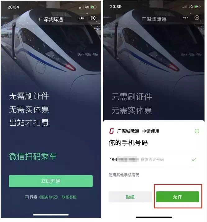❶ 微信搜索或线下扫码,进入小程序“广深城际通”,点击“立即开通”,授权手机号码允许使用。