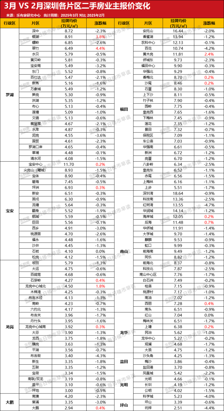乐有家研究中心数据显示,二手住宅挂牌均价连续6个月稳定在6.6万元/㎡左右,分片区看,3月有15个片区挂牌价小幅上涨,多位于重点学校区域及城区核心区域,如罗湖的翠竹、银湖,宝安的宝中,龙岗的龙岗中心城,福田香梅北,南山后海、海岸城,龙华民治等。其他片区降幅也逐步收窄,在1%-2%左右波动。