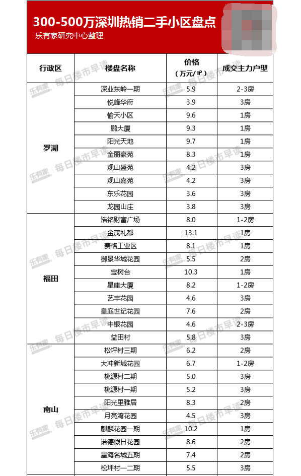 日前,乐有家研究中心整理了2024年以来各区域的总价在300-500万的热销小区榜单,涵盖了1-4房房源。其中,福田、南山、罗湖的热门小区如下: