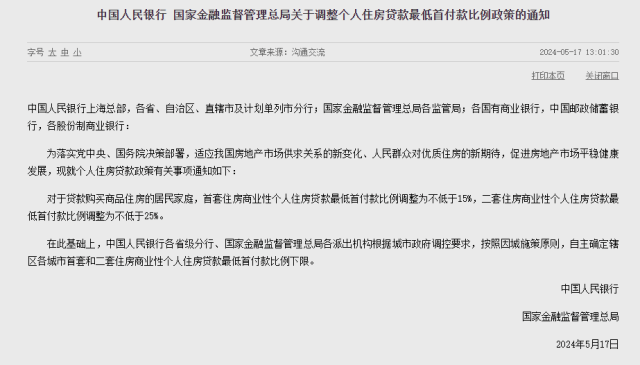 中国人民银行 国家金融监督管理总局关于调整个人住房贷款最低首付款比例政策的通知