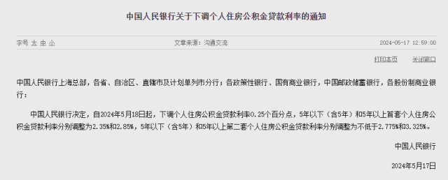 中国人民银行决定,自2024年5月18日起,下调个人住房公积金贷款利率0.25个百分点,5年以下(含5年)和5年以上首套个人住房公积金贷款利率分别调整为2.35%和2.85%,5年以下(含5年)和5年以上第二套个人住房公积金贷款利率分别调整为不低于2.775%和3.325%。