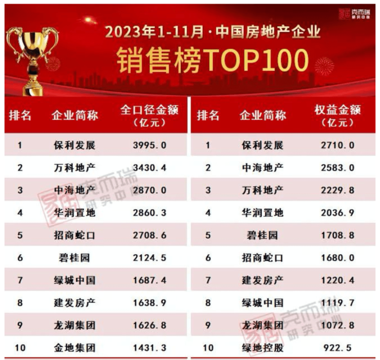 11月30日,克而瑞地产研究中心发布的“2023年1-11月中国房地产企业销售TOP100排行榜”显示,保利发展以3995亿元的销售额排名第一,紧随其后的为万科集团,销售额3430.4亿元,第三名为中海地产,销售额2870亿元。