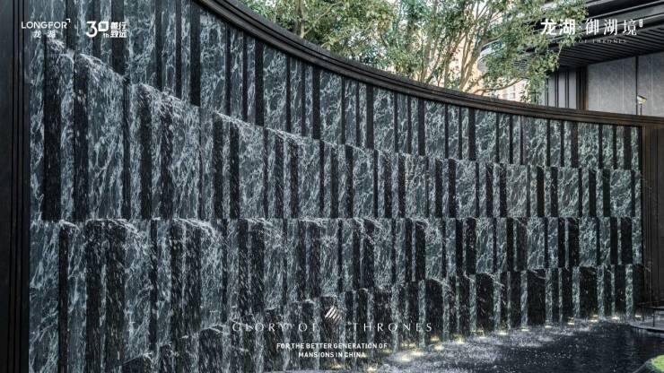 水院一侧约4米高的镜湖环岛瀑布景墙,整面墙采用的是Prada绿奢石与安哥拉黑大理石拼接,流光水瀑映射青光水影,带来非凡的视觉享受。