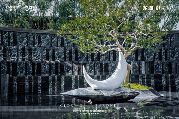 通过入户大堂,来到浮光水院,便看到一轮汉白玉玄月浮于静水之上,天光云影、月影绰绰。这是属于御湖境的图腾——心湖之月雕塑。这座雕塑臻选10m³的汉白玉,耗时300个工时手工打磨而成。心湖之月旁是斜飘造型红果冬青,观赏性极佳,四季常绿,秋冬红果累累,与月池中相伴,水底辅以星光灯与晶莹洁白的玄月相融,形成星、月、树璀璨辉映的盛境。