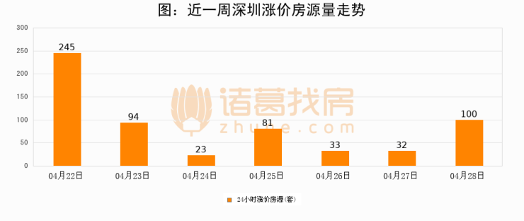 根据诸葛找房数据显示,深圳24小时涨价房源量为100套,较04月27日增加68套,环比上涨212.5%。与此同时,涨价房源占比小幅扩大,业主信心有所提升。