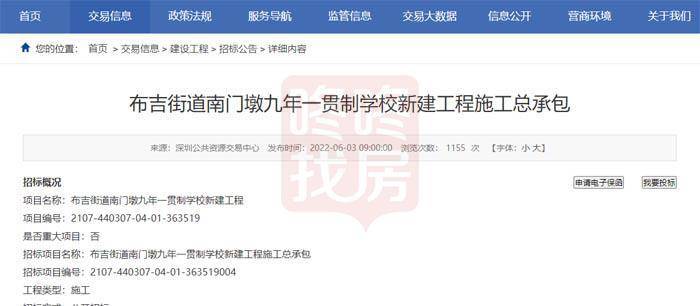 日前,深圳公共资源交易中心发布布吉街道南门墩九年一贯制学校新建工程施工总承包招标公告。