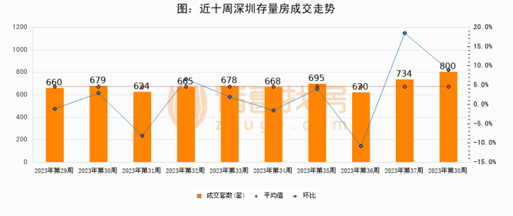 存量房方面,第38周深圳存量房成交800套,较上周增加66套,环比上涨9%。从近十周成交走势来看,周均成交套数为682套,本周高于平均水平17.3%。