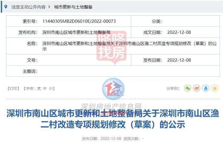 同天,南山区城市更新和土地整备局发布《深圳市南山区渔二村改造专项规划修改(草案)》。