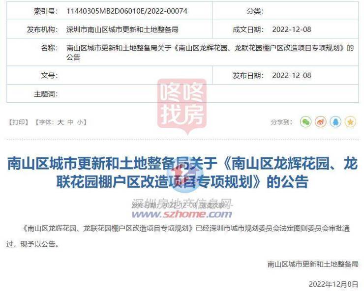 12月8日,南山区城市更新和土地整备局发布《南山区龙辉花园、龙联花园棚户区改造项目专项规划》。