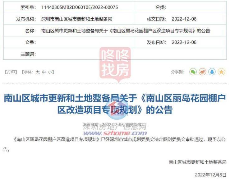 12月8日,南山区城市更新和土地整备局发布《南山区丽岛花园棚户区改造项目专项规划》。