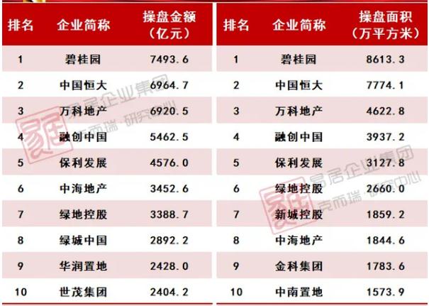 先来看一下全国房企排名,碧桂园以7493亿操盘金额及8613万平米的操盘面积再次稳坐头把交椅,而第二名是中国恒大,万科则位居第三。