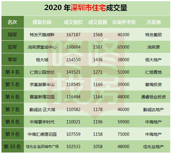 其中,平湖的特发天鹅湖畔以167187平/1568套取得了2020年深圳市成交量冠军,成交价4.03万/平;鸿荣源壹成中心成交160684平/1507套,位居亚军,市场参考价6.5万/平;恒大城成交154550平/1436套,位居季军,市场参考价3.8万/平。