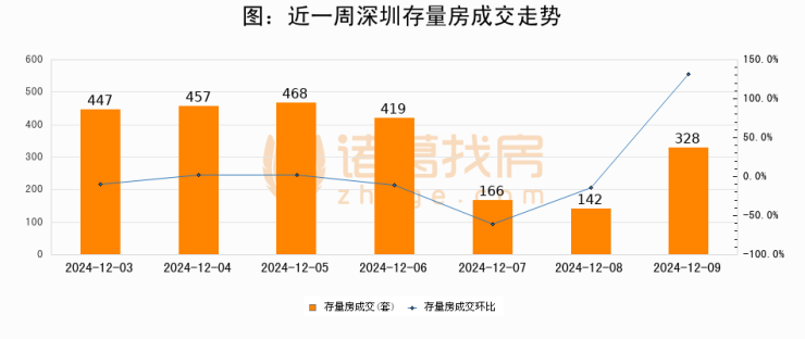 从存量房来看,2024年12月09日深圳存量房单日成交328套,比昨日增加186套,环比上涨131%。从近一周存量房成交来看,深圳存量房日均成交套数为346套,12月09日单日成交328套,低于近一周平均水平5.2%。