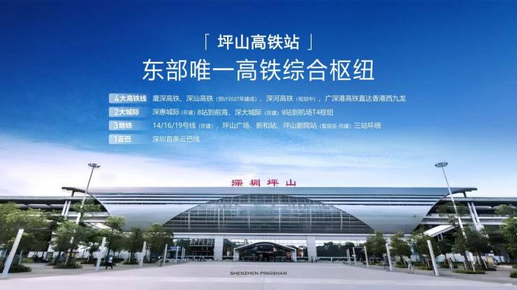 近14号线坪山广场站&16号线新和站&19号线(在建)坪山剧院站(暂定名-在建)三地铁口环绕,近坪山高铁站、深惠(在建)/深大(在建)城际、坪山云巴等多轨交通,家门口坪山大道连接5大高/快速路,便捷畅联福田、南山。