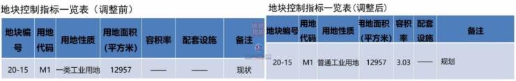 调整后,20-15地块规划用地面积不变,规划用地性质调整为普通工业用地(M1),容积率调整为3.03,备注:规划。