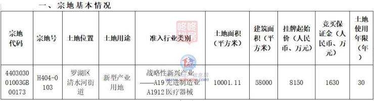 宗地号H404-0103,准入行业为战略性新兴产业——A19先进制造业A1912医疗器械,土地使用面积10001.11平方米,建建面积58000平方米,挂牌起始价8150万。