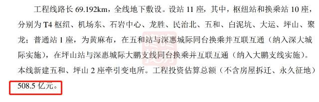 而在6月29日深圳地铁发布的深大城际深圳机场至坪山段工程环境影响评价报批前信息公开(补充公示)中,整个工程投资估算508.5亿。