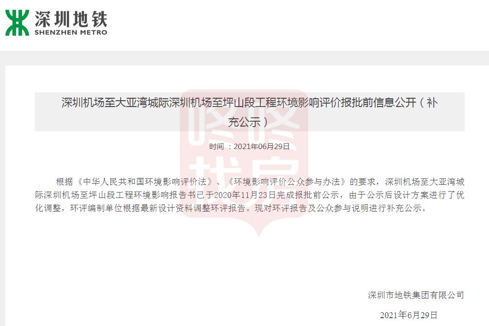 6月29日,深圳地铁发布深圳机场至大亚湾城际深圳机场至坪山段工程环境影响评价报批前信息公开(补充公示),对设计方案进行了优化调整。