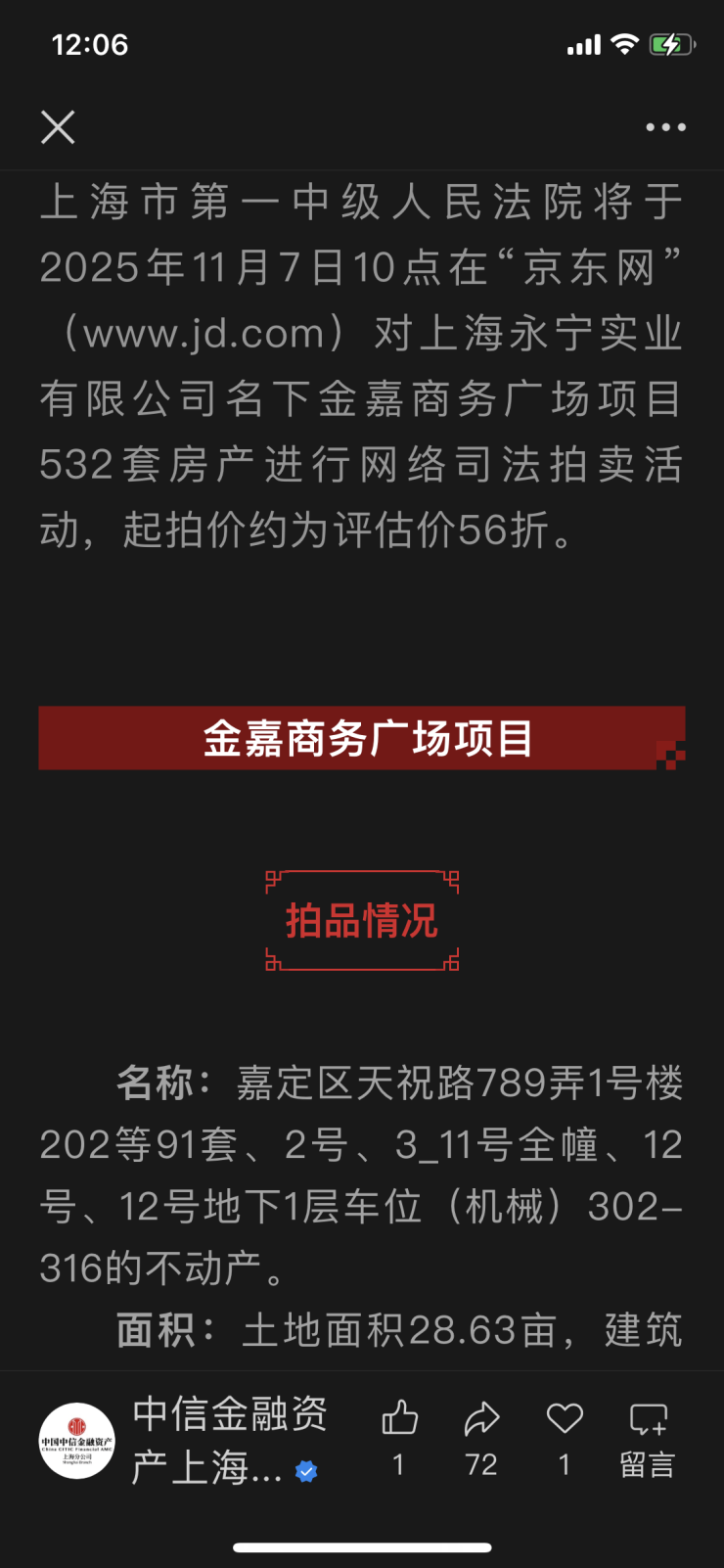 上海嘉定区金嘉商务广场项目部分资产第二次拍卖,流拍了。