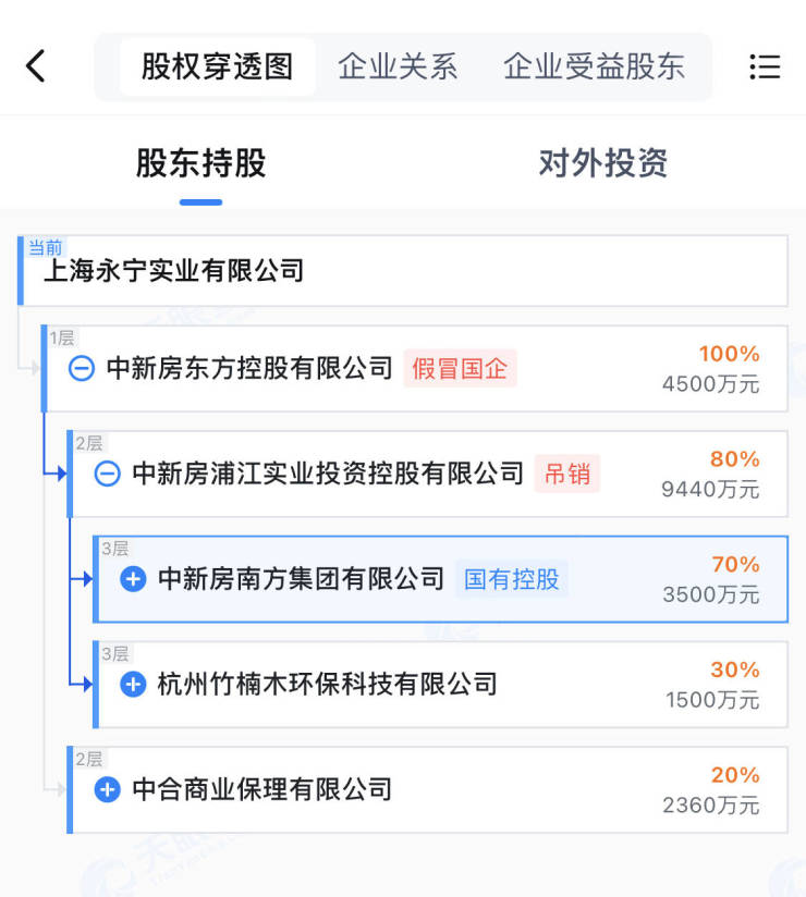 据天眼查信息,中新房东方控股有限公司持有上海永宁实业有限公司100%股权,中新房浦江实业投资控股有限公司、中合商业保理有限公司分别持有前者80%、20%股权;中新房南方集团有限公司、杭州竹楠木环保科技有限公司,则分别持有新房浦江实业投资控股有限公司70%、30%股权。