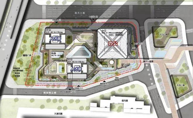 根据规划,项目由一座标志性的甲级写字楼(10万㎡)、两栋可售型人才住宅(7万㎡)和一个购物中心裙楼组成。整个项目总共3栋楼,1栋办公楼,2栋可售人才房,人才房为55层,6梯10户。