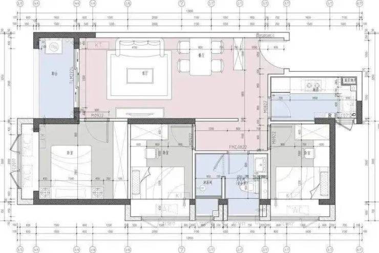 建面约90㎡的3房2厅2卫户型。