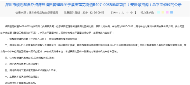 据市规划和自然资源局公示,2024年12月底安居景贤于申请了修改总平面图,调整了部分停车位、建筑高度等内容,相关经济经济指标也同步调整,如,容积率从4.38→4.35、计容积率建面从13500.13㎡→13420.56㎡等。