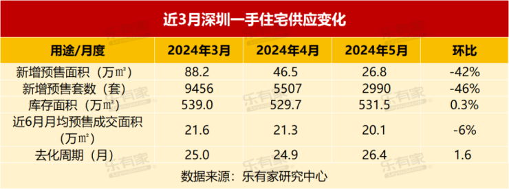 在3-4月大量供应后,5月新增一手住宅供应量减少至2990套,环比下降46%。库存面积增加至531.5万㎡,去化周期为26.4个月,与4月比拉长了1.6个月。