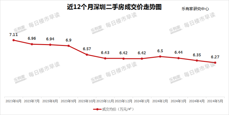 乐有家研究中心监测显示,5月深圳二手房成交价格为6.27万元/㎡,环比下跌1.3%,对比4月跌幅有所收窄。