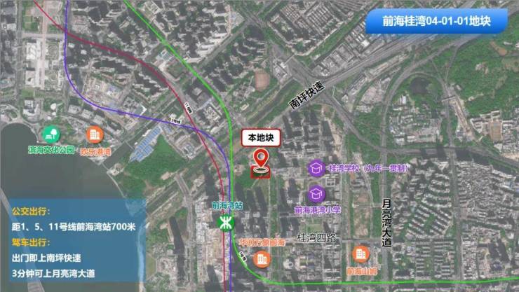 桂湾配套也已日渐成熟。地块靠近前海湾地铁站,目前这里可换乘1/5/11号地铁线,未来前海国际枢纽中心建成后,还可以换乘穗莞深城际、规划港深西部铁路。