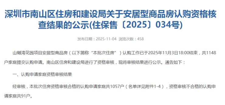 11月4日,南山区住房和建设局公示了山樾湾花园安居房的认购情况,此次共有1148户家庭提交认购申请,经审核,本批次住房资格审核合格的认购申请家庭共1057户,资格审核不合格的认购申请家庭共91户。