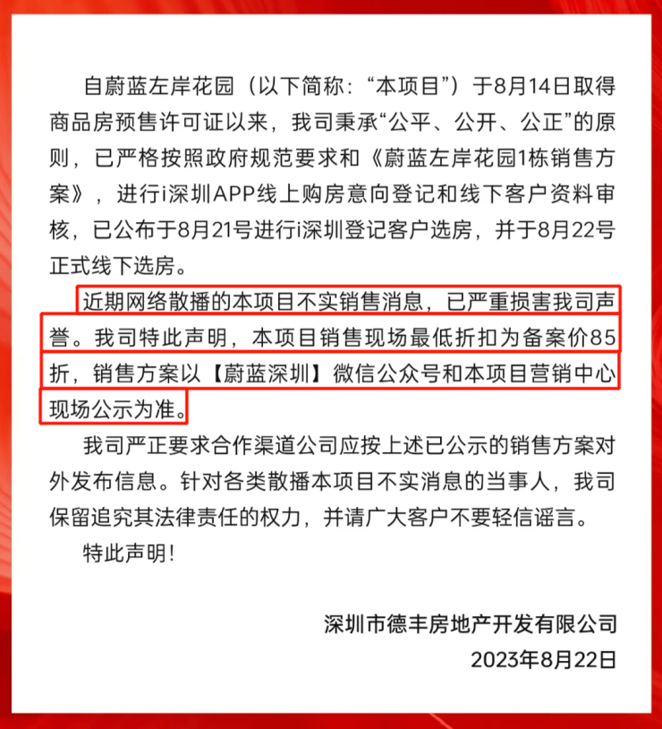 不过,8月22日蔚蓝左岸花园的开发商发布声明称,现场最低折扣为备案价的85折,对于其他的优惠模式则闭口不提。