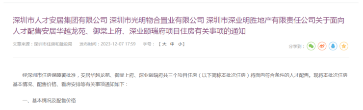 12月7日深圳住建局发布可售人才房龙华安居华越龙苑、光明御棠上府、深业颐瑞府的配售公告,本批次配售住房共849套,其中两房户型16套,三房户型833套。
