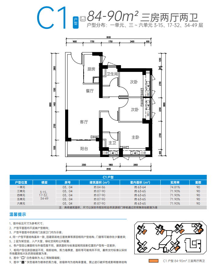 房源信息:本次配售房源位于1栋一、三、四、五、六单元,共810套,均为建筑面积约84-90㎡的三房房源
