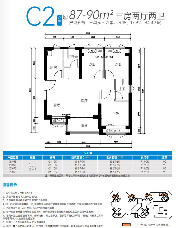 房源信息:本次配售房源位于1栋A座及C座,共36套,其中建面约69-70㎡两房户型15套;建面约88-90㎡的三房户型21套