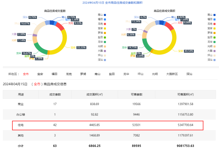 2024年4月15日新房住宅共网签42套。宝安14套;福田1套;龙岗 4套;罗湖1套;南山2套;盐田0套;龙华7套;坪山7套;光明3套;大鹏1套;深汕2套。