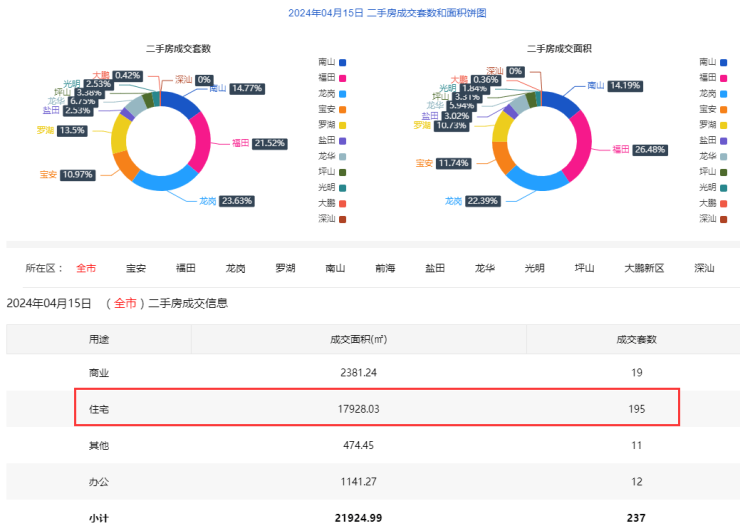 2024年4月15日二手房住宅网签195套。宝安19套;福田36套;龙岗51套;罗湖28套;南山28套;盐田6套;龙华15套;光明3套;坪山8套;大鹏1套。