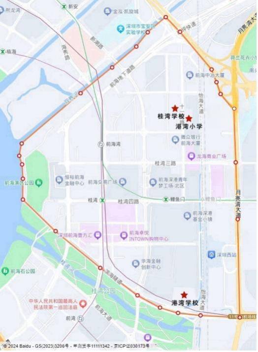 (二)招生范围:下图红线合围区域内为桂湾大学区招生范围。桂湾大学区内包含:南山实验教育集团港湾学校、 南二外前海创新教育集团港湾小学、南二外前海创新教育集团桂湾学校。