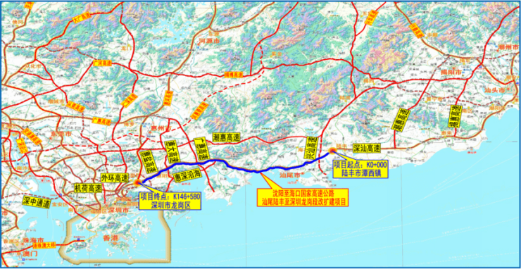 全长约146.55km,其中深汕段全长约18.48km,是目前深汕唯一一条直连深圳的高速、与深圳双城互动最主要的通道之一。