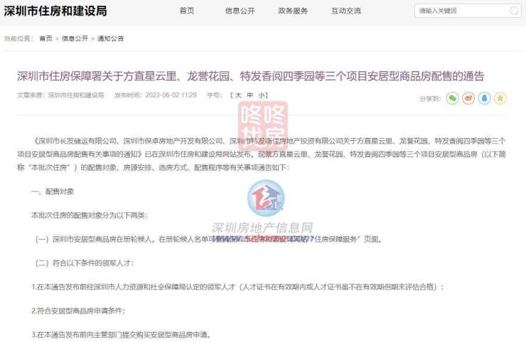 6月2日,深圳市住房保障署发布了方直星云里、龙誉花园、特发香阅四季园等三个项目安居型商品房配售的通告。