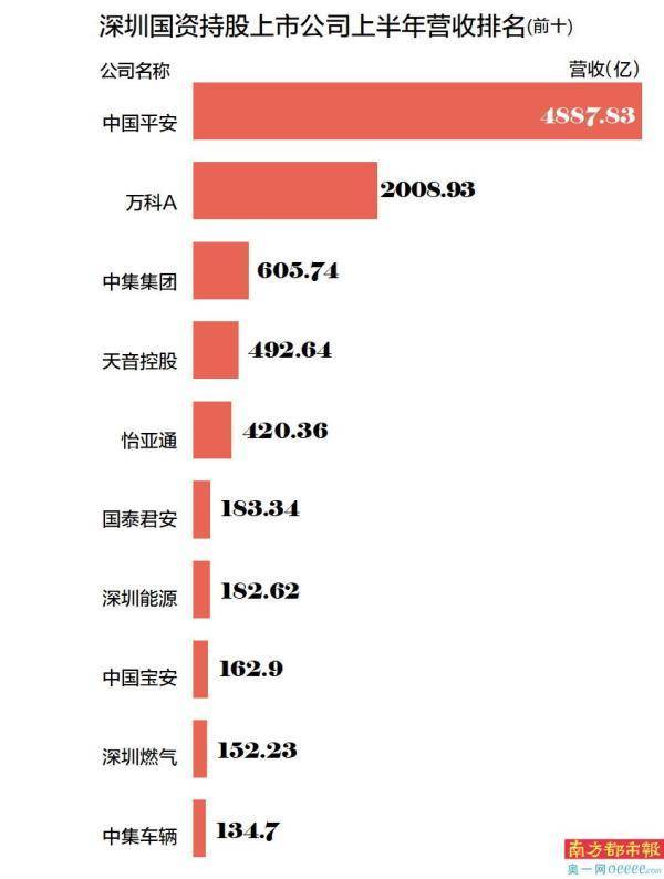 位列营收榜榜首的是中国平安,上半年实现营收4887.83亿元;老牌房企万科A位列第二,营收约为2008.93亿元;位列第三的是中集集团,营收约为605.74亿元;第四位是天音控股,实现营收492.64亿元;第五位是怡亚通,实现营收420.36亿元。