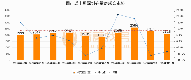 存量房方面,第51周深圳存量房成交2118套,较上周减少190套,环比下降8.2%。从近十周成交走势来看,周均成交套数为2129套,本周低于平均水平0.5%。
