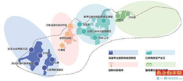据悉,北部都会区分为四大区域,各有不同的发展定位和主题,由西至东分别为:高端专业服务和物流枢纽、创新科技地带、口岸商贸及产业区、蓝绿康乐旅游生态圈。南都记者逐个梳理四大区域规划中与深圳密切相关的内容,从中可以看到接下来深港合作的相关重点谋划。