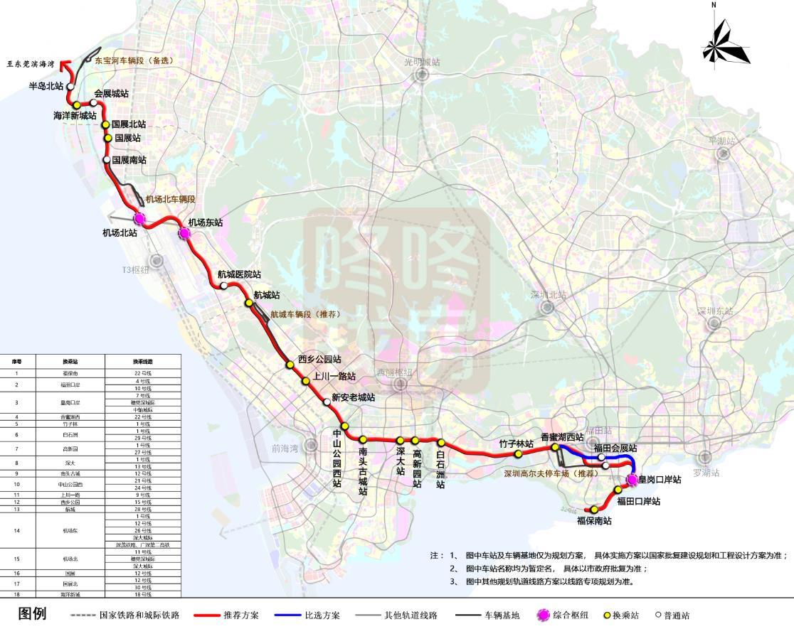 规划方案显示,应龙岗区诉求,新增环城南路通道作为比选线位,可增加对科博中心及环城南路沿线的轨道覆盖,但无法与21号线换乘;应宝安区诉求,新增规划石龙仔路通道作为比选线位,可加强对石龙仔核心区的服务,但对石龙仔路南侧德政路沿线覆盖较弱。