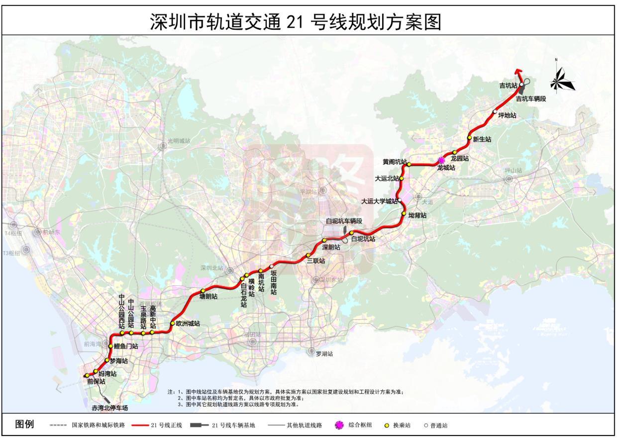 其中,21号地铁线线路起自前海妈湾片区,终止于坪地吉坑片区,并预留延伸至惠州的条件。