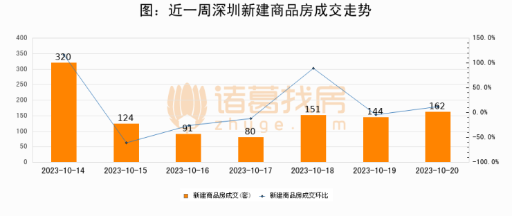 根据深圳市住房和城乡建设局数据显示,2023年10月20日深圳新建商品房成交162套,较昨日增加18套,环比上涨12.5%