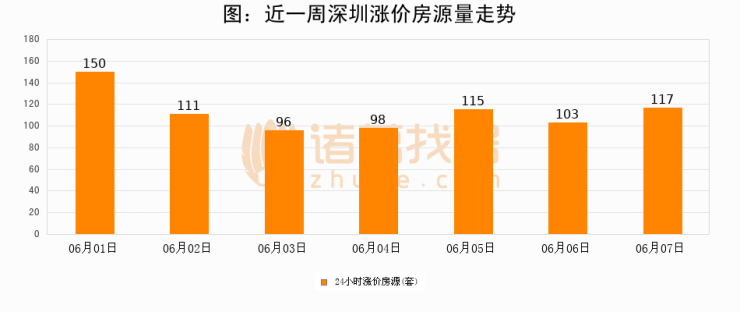 根据诸葛找房数据显示,深圳24小时涨价房源量为117套,较06月06日增加14套,环比上涨13.6%。与此同时,涨价房源占比小幅扩大,业主信心有所提升。